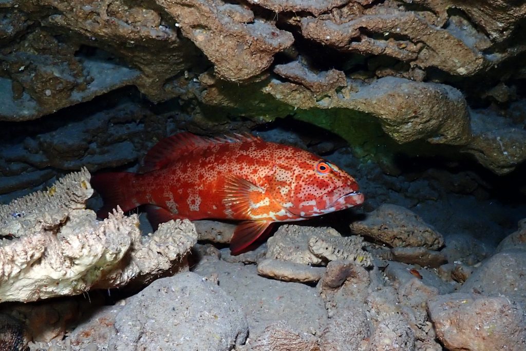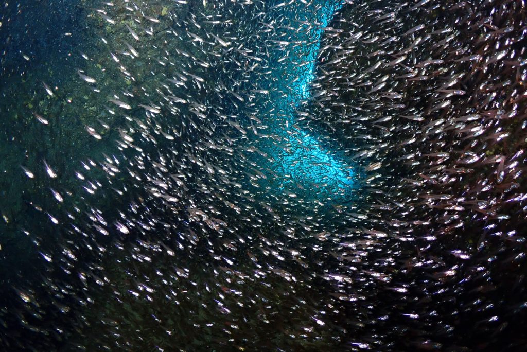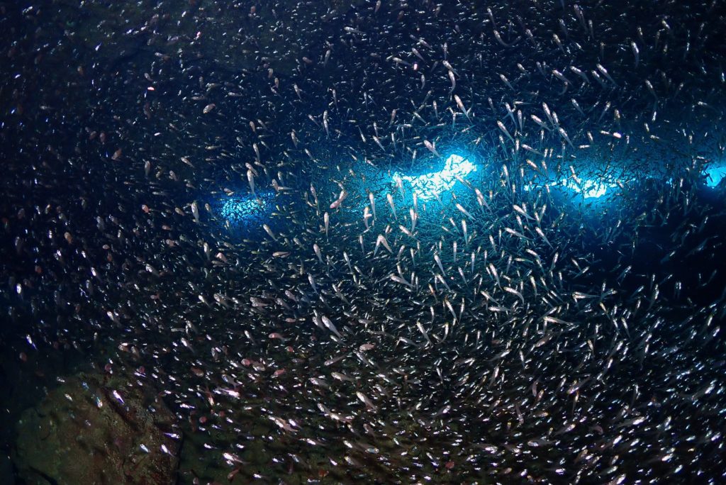 光がほとんど入ってこないぐらい、穴の中にキンメが密集してます(笑)